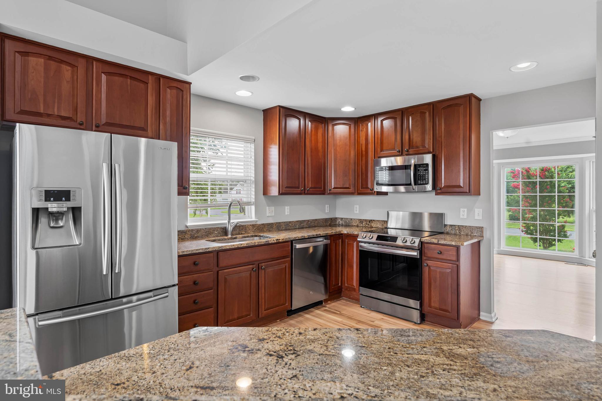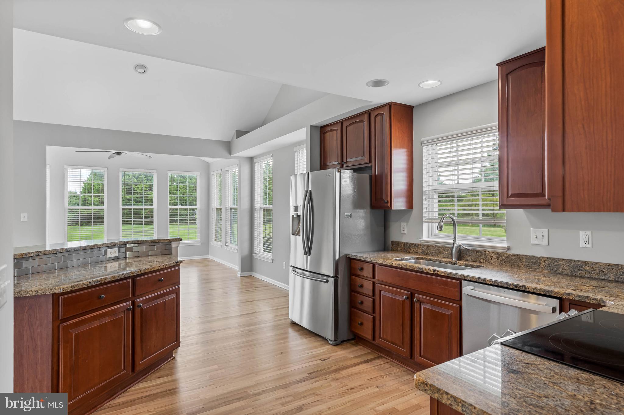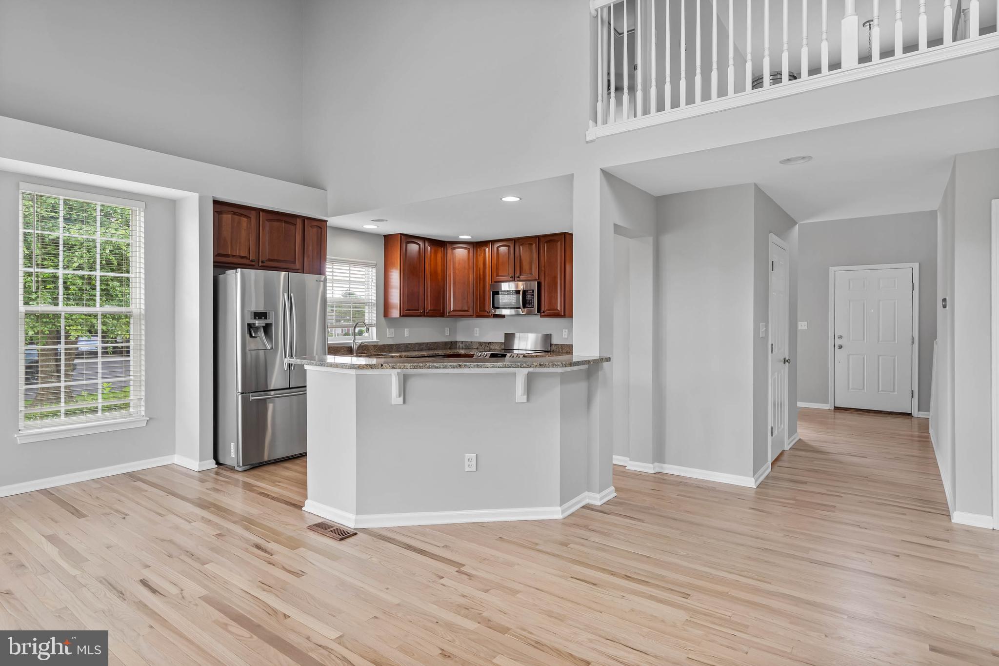 Step inside to discover gleaming, just-refinished hardwood floors that flow seamlessly throughout the entire home. At the front, a formal dining room with a bay window welcomes natural light and overlooks the front yard. The chef's kitchen boasts stainless steel appliances, granite countertops, rich cherry cabinets, and an open layout that connects perfectly to the great room, sunroom, and dinette area, ideal for entertaining and everyday living.