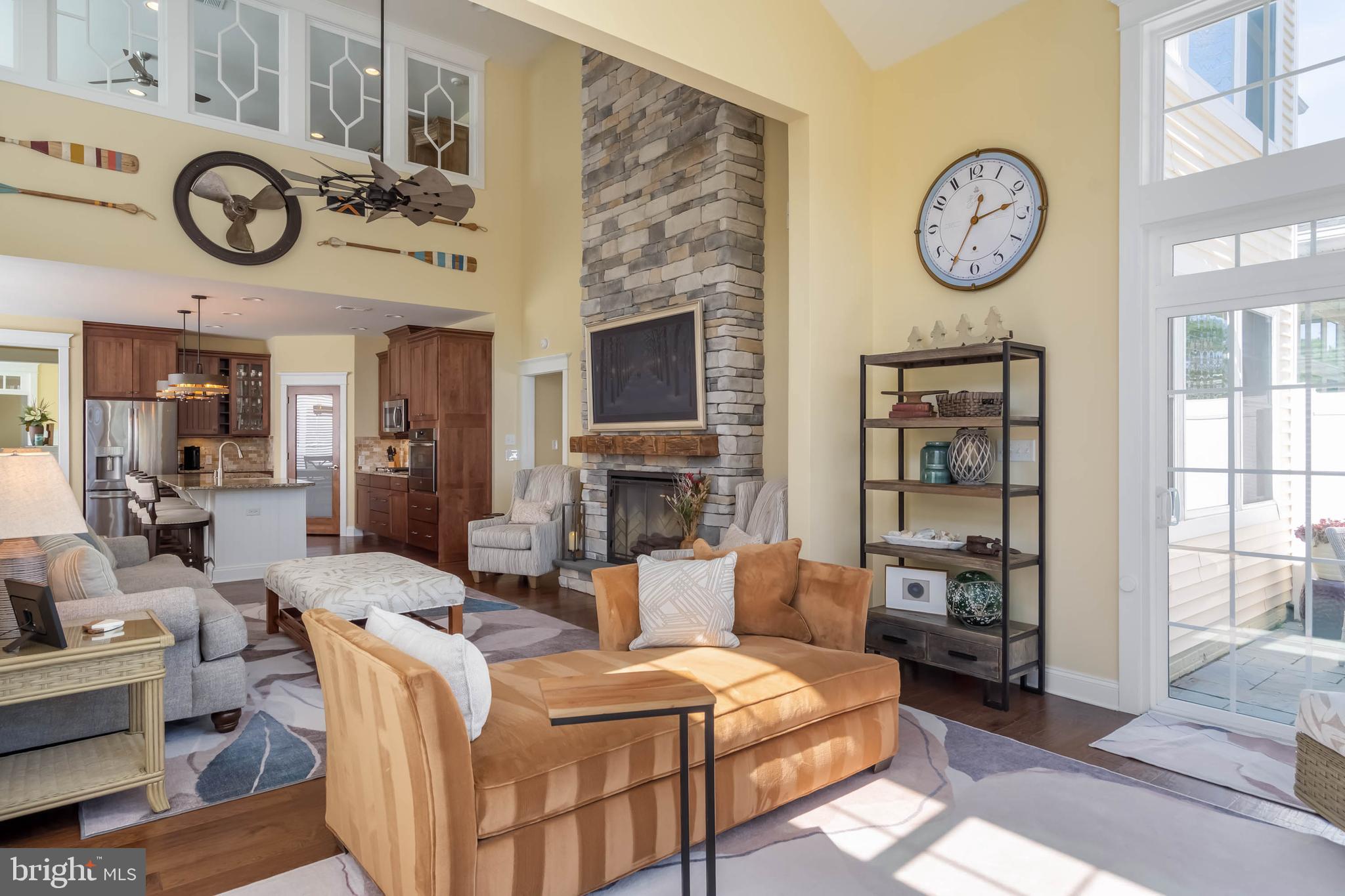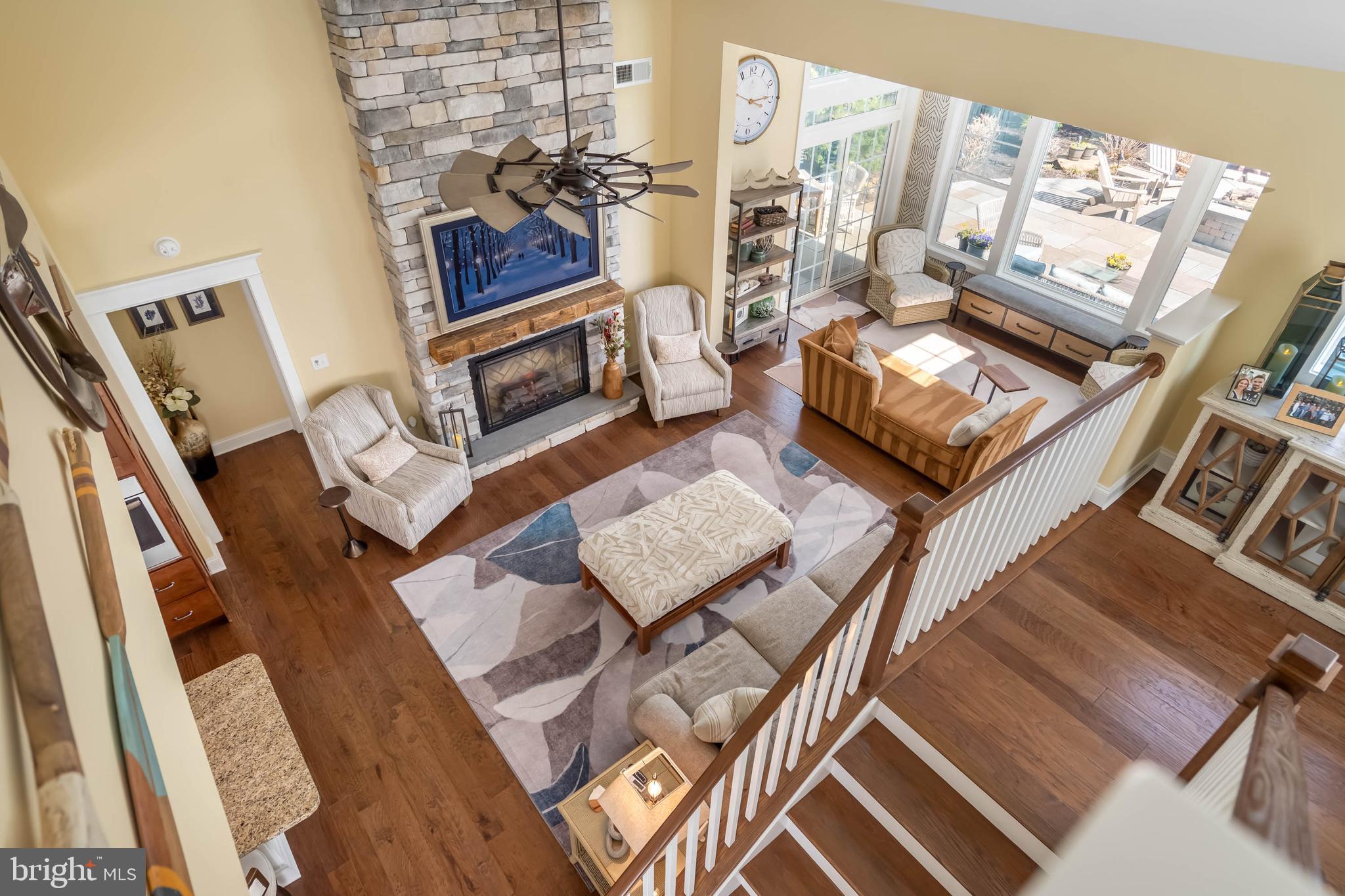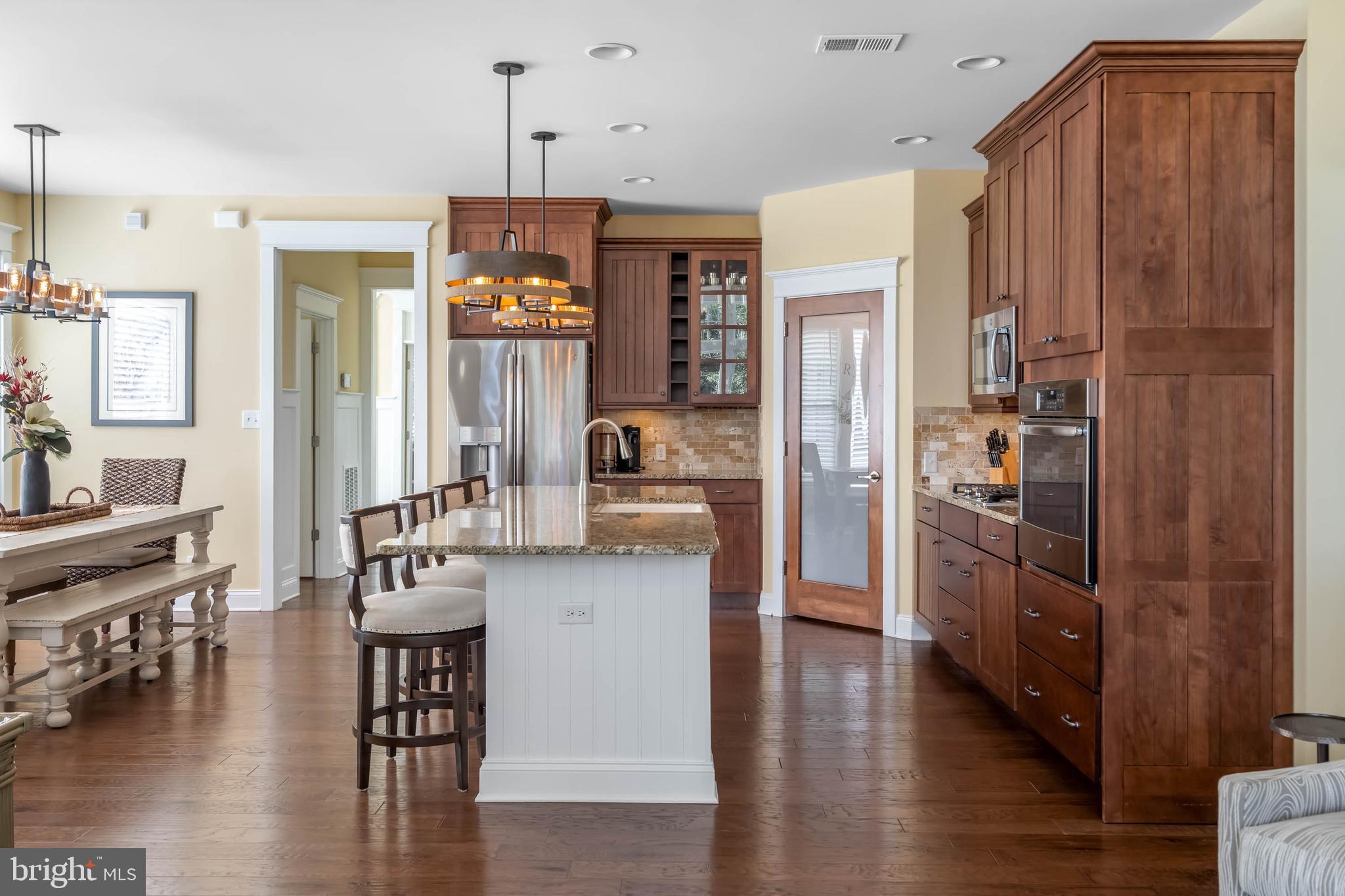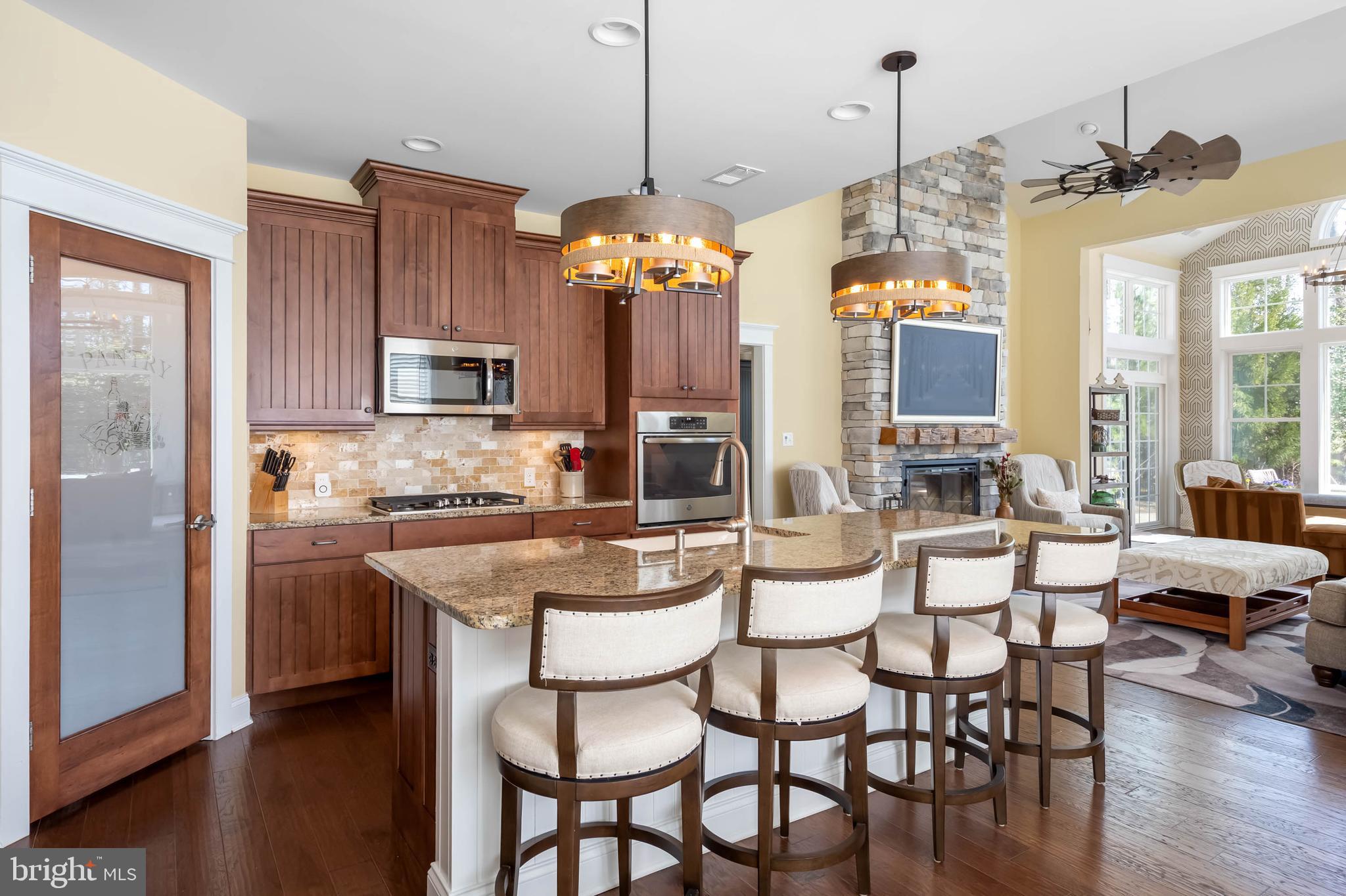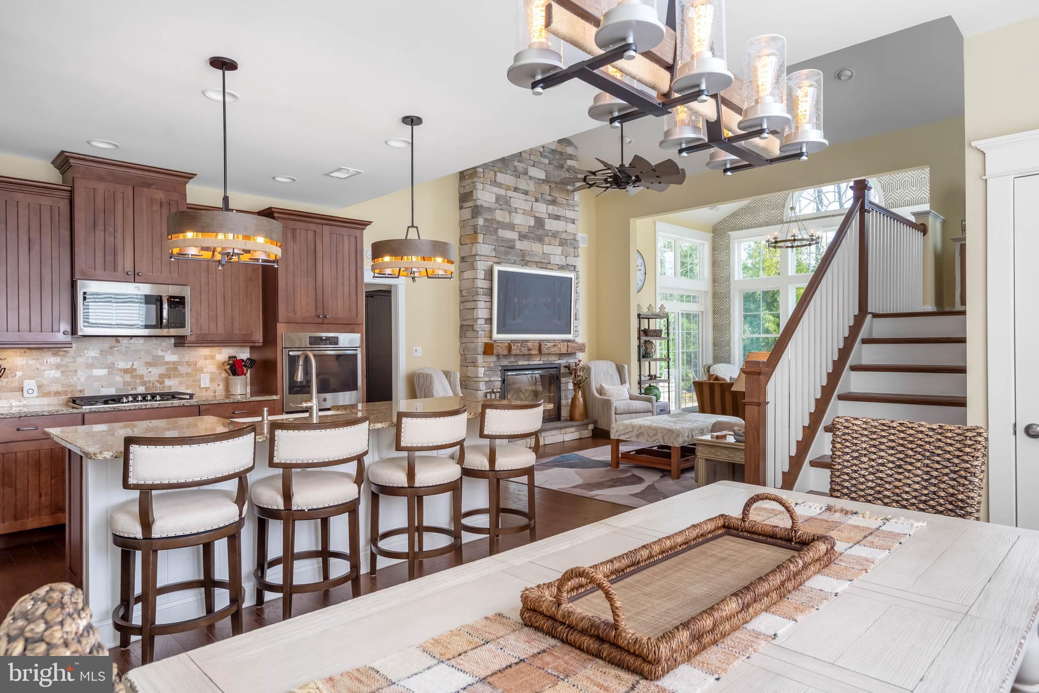 From the moment you arrive, the charming covered front porch and second-floor porch set the tone for the exceptional design found throughout. Inside, the first floor showcases hand-scraped, wide-plank hickory engineered hardwood flooring and a thoughtfully designed layout, including a private study, convenient laundry room, and powder room. The heart of the home is the stunning gourmet kitchen, featuring full-overlay cabinetry with elegant shutter detailing, granite countertops, a farmhouse sink, stainless steel appliances, a cooktop, wall oven, exterior-vented microwave, and French door refrigerator. The kitchen flows seamlessly into the light-filled dining area and the dramatic great room, highlighted by a vaulted ceiling and a striking floor-to-ceiling stone fireplace.