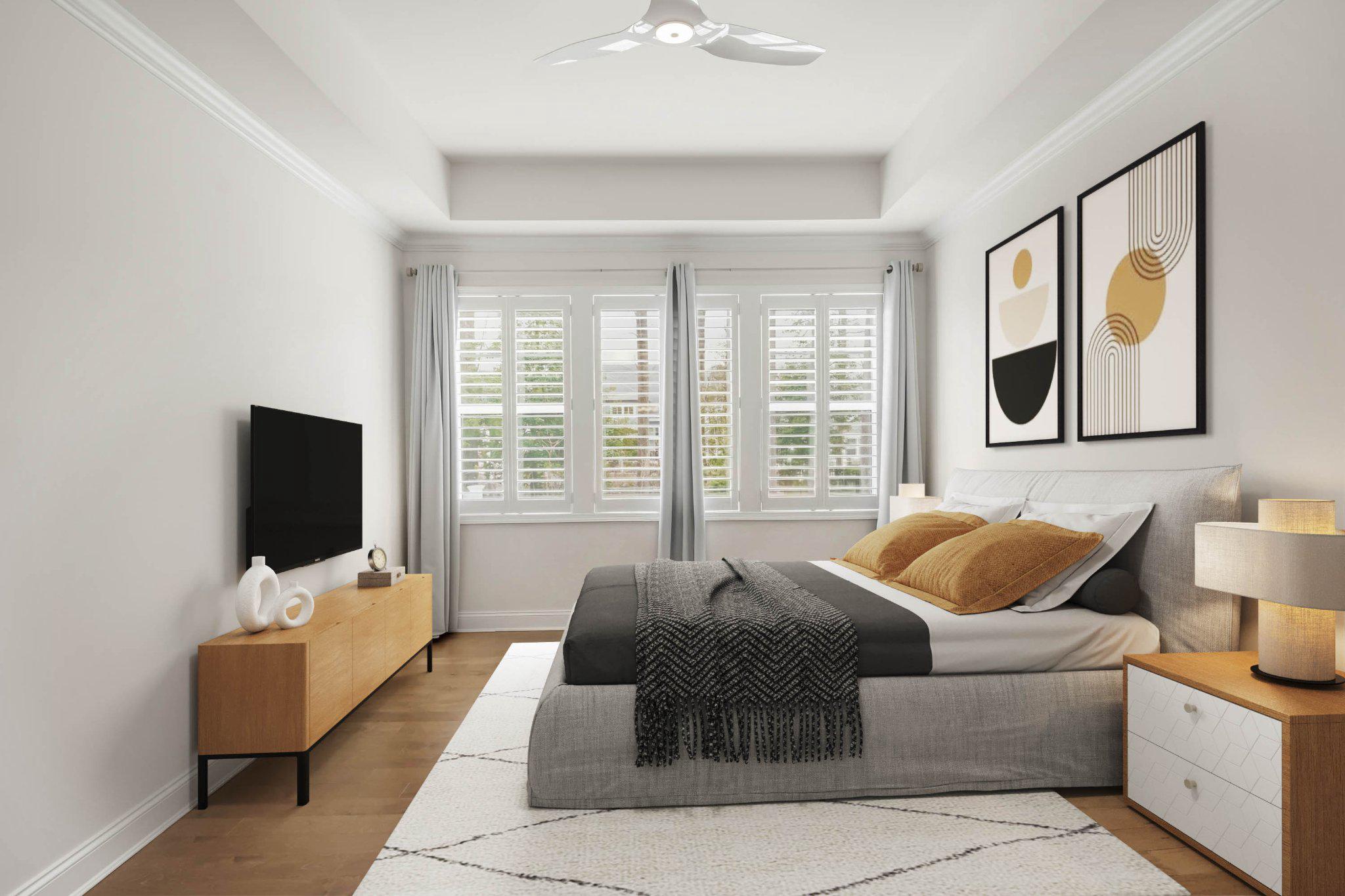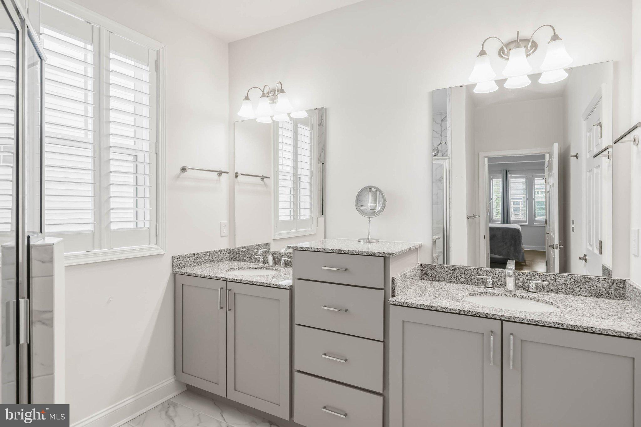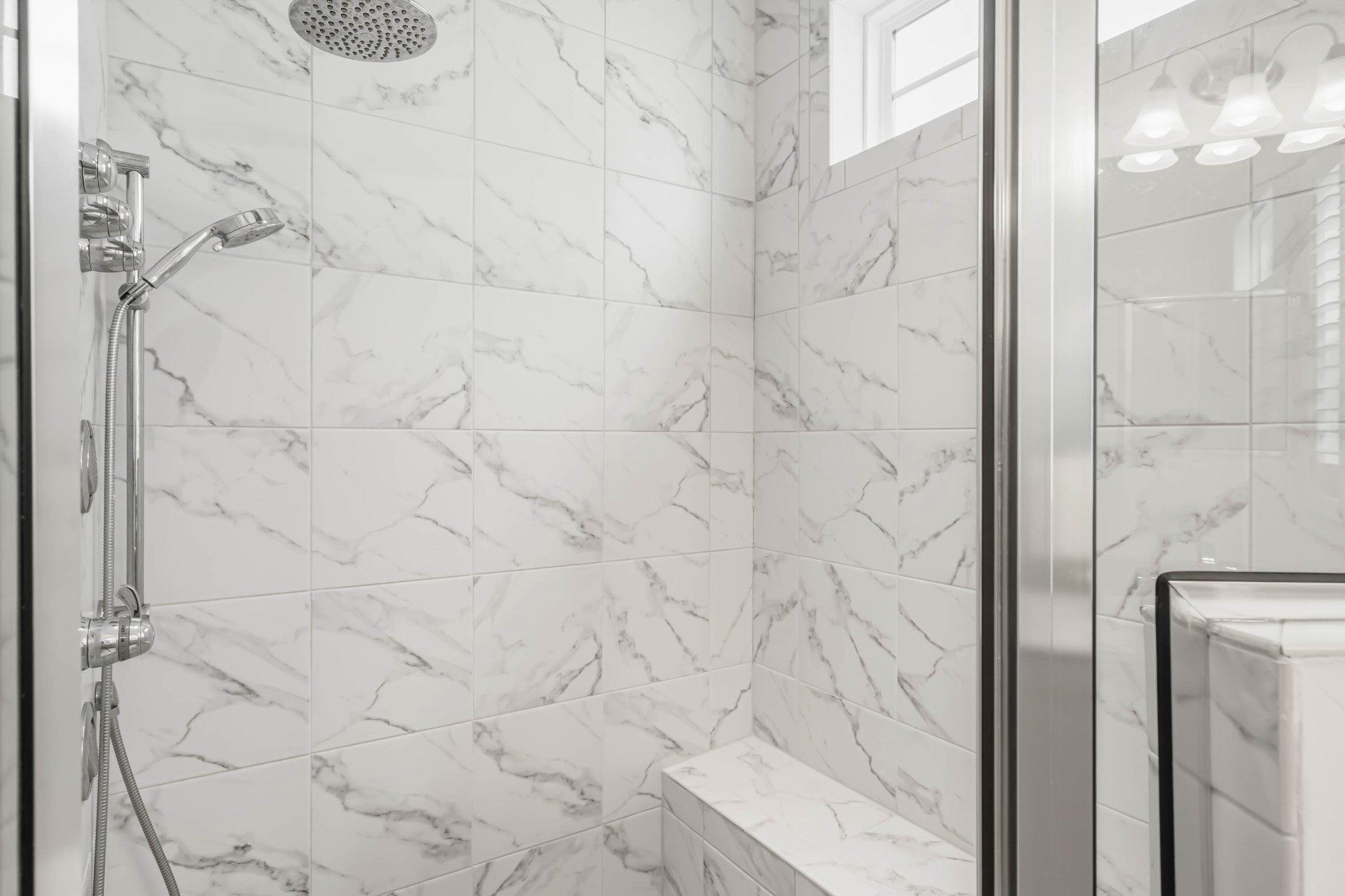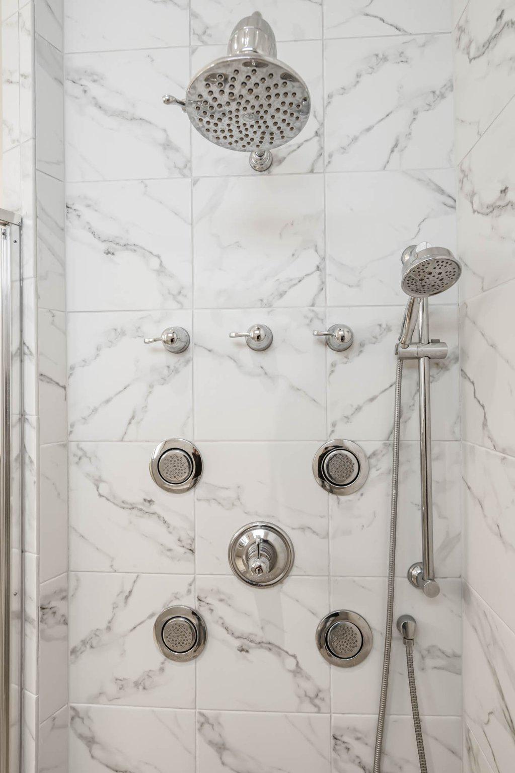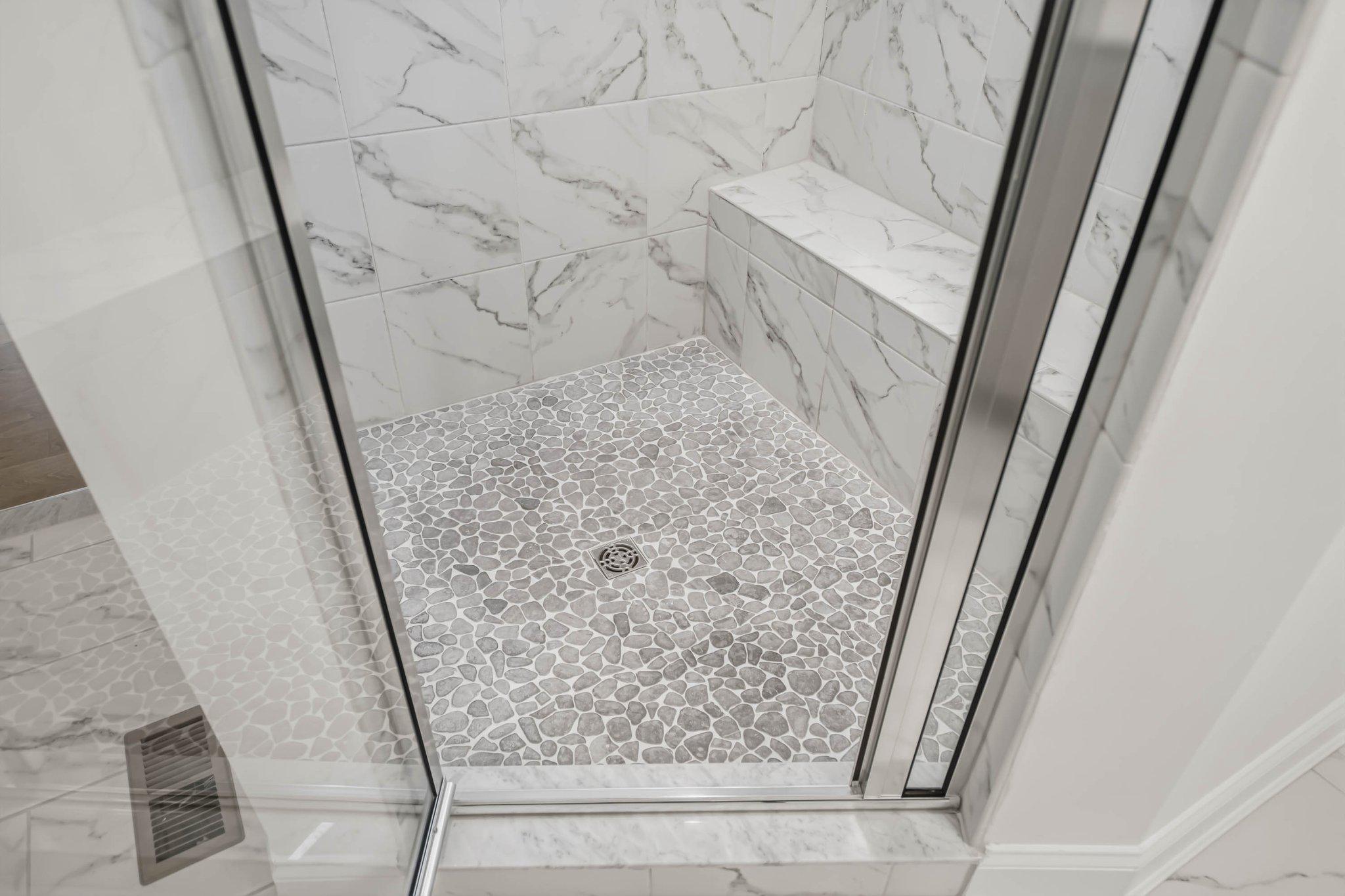 Tucked away for ultimate privacy, the luxurious owner's suite serves as a serene retreat with two expansive walk-in closets and a spa-inspired ensuite bath. The upgraded shower is a true highlight, showcasing pebble tile flooring, floor-to-ceiling tile, and multiple body sprayers that create a soothing, resort-like experience right at home.