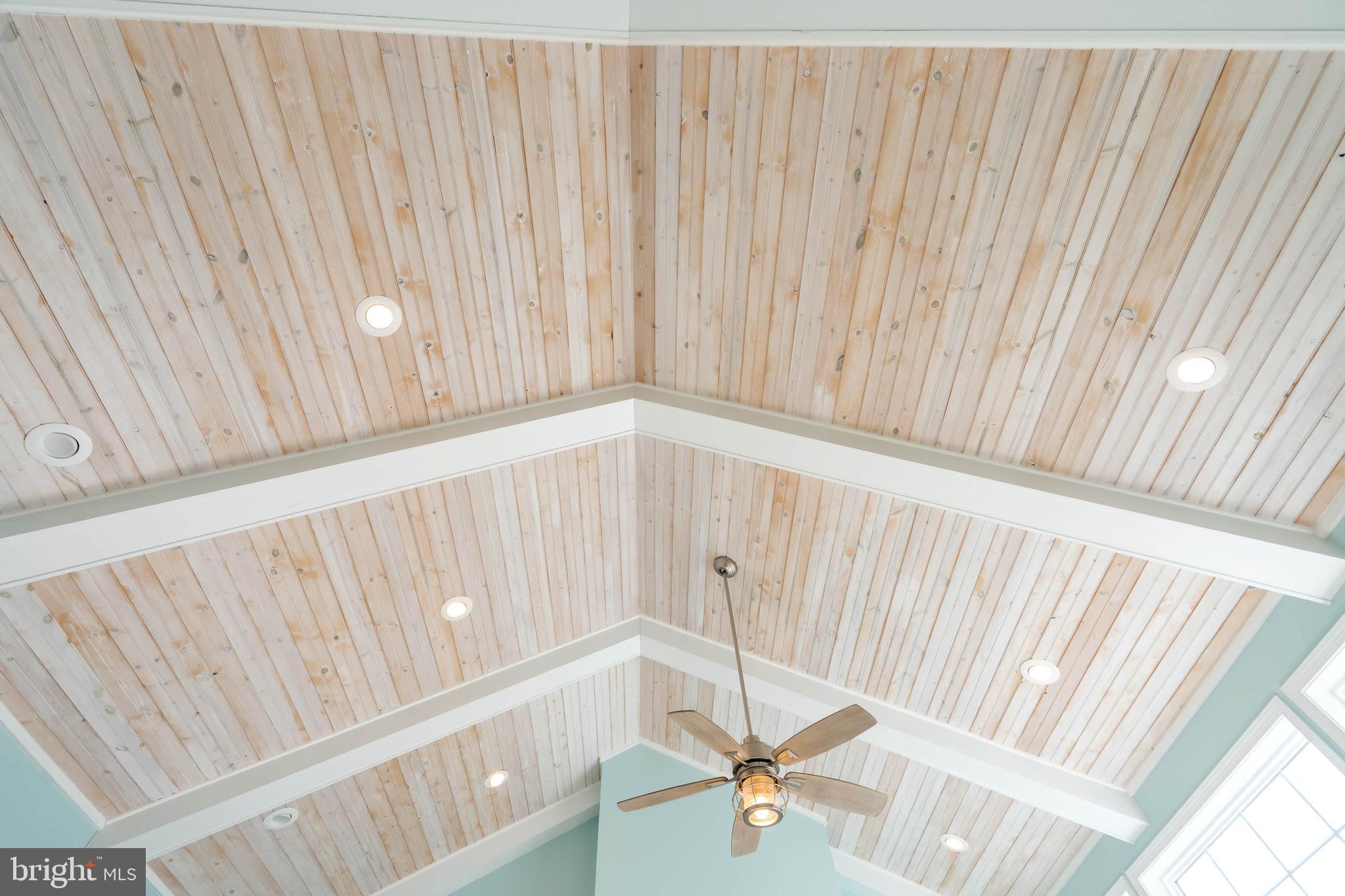 The front of the home offers a private study with French doors, a custom-built bookcase, and a striking whitewashed shiplap accent wall. The heart of the home is the breathtaking great room, completely open to the kitchen and dining area and highlighted by a dramatic cathedral ceiling adorned with whitewashed shiplap and white beams. A gas fireplace with custom built-in cabinetry anchors the space, along with an additional built-in dry bar featuring a convenient mini fridge, perfect for entertaining.