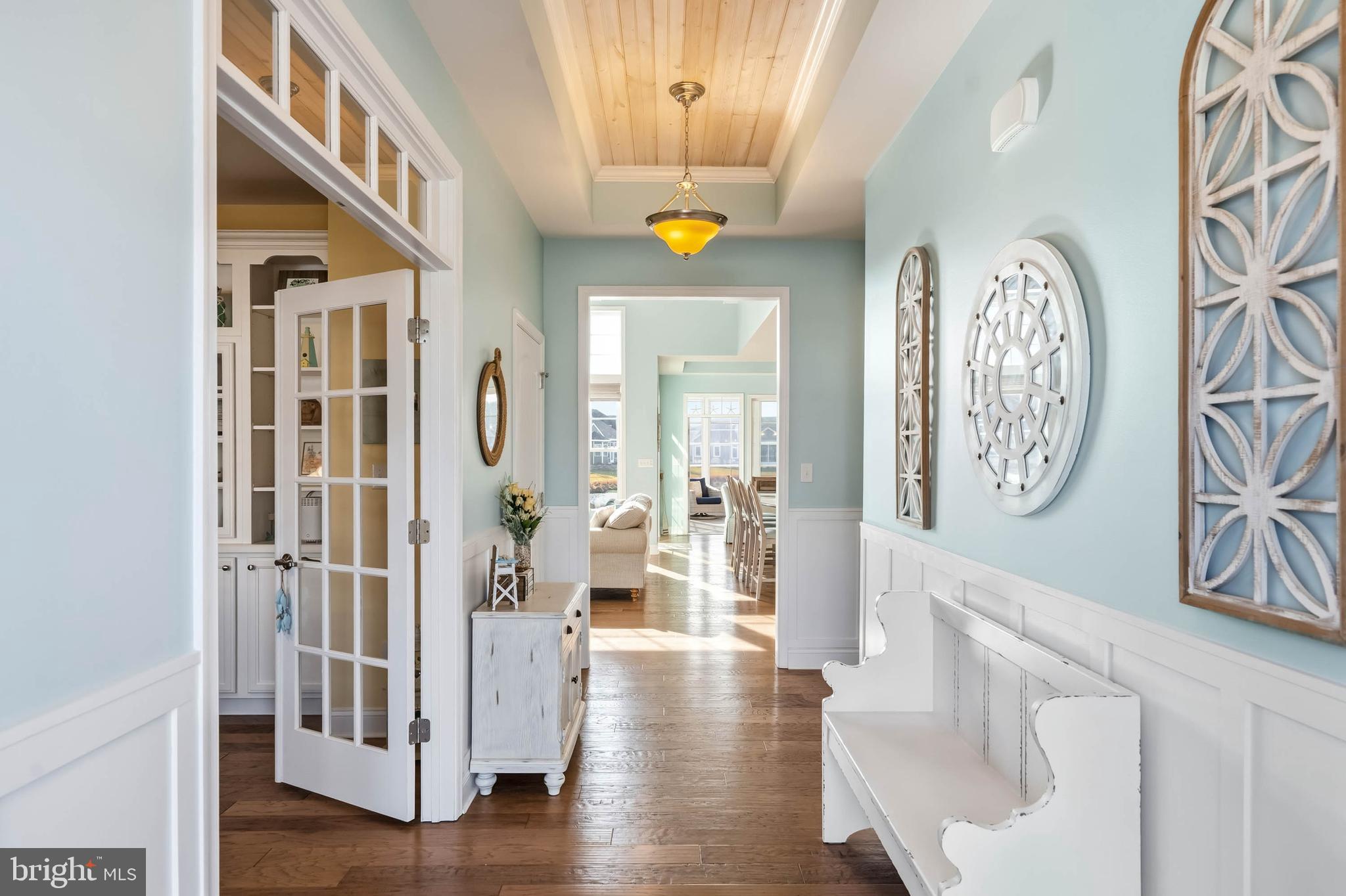 Welcome to an exquisite new listing in the highly sought-after Peninsula Lakes community of Millsboro, Delaware, a coastal-inspired Mayberry by Schell Brothers, perfectly positioned on arguably one of the best homesites in the neighborhood with a welcoming oversized front porch. This home is an absolute showstopper from the moment you step through the front door, featuring stunning 5" wide hickory hardwood floors that flow throughout the entire first floor, complemented by custom plantation shutters, designer window treatments, and custom paint throughout.