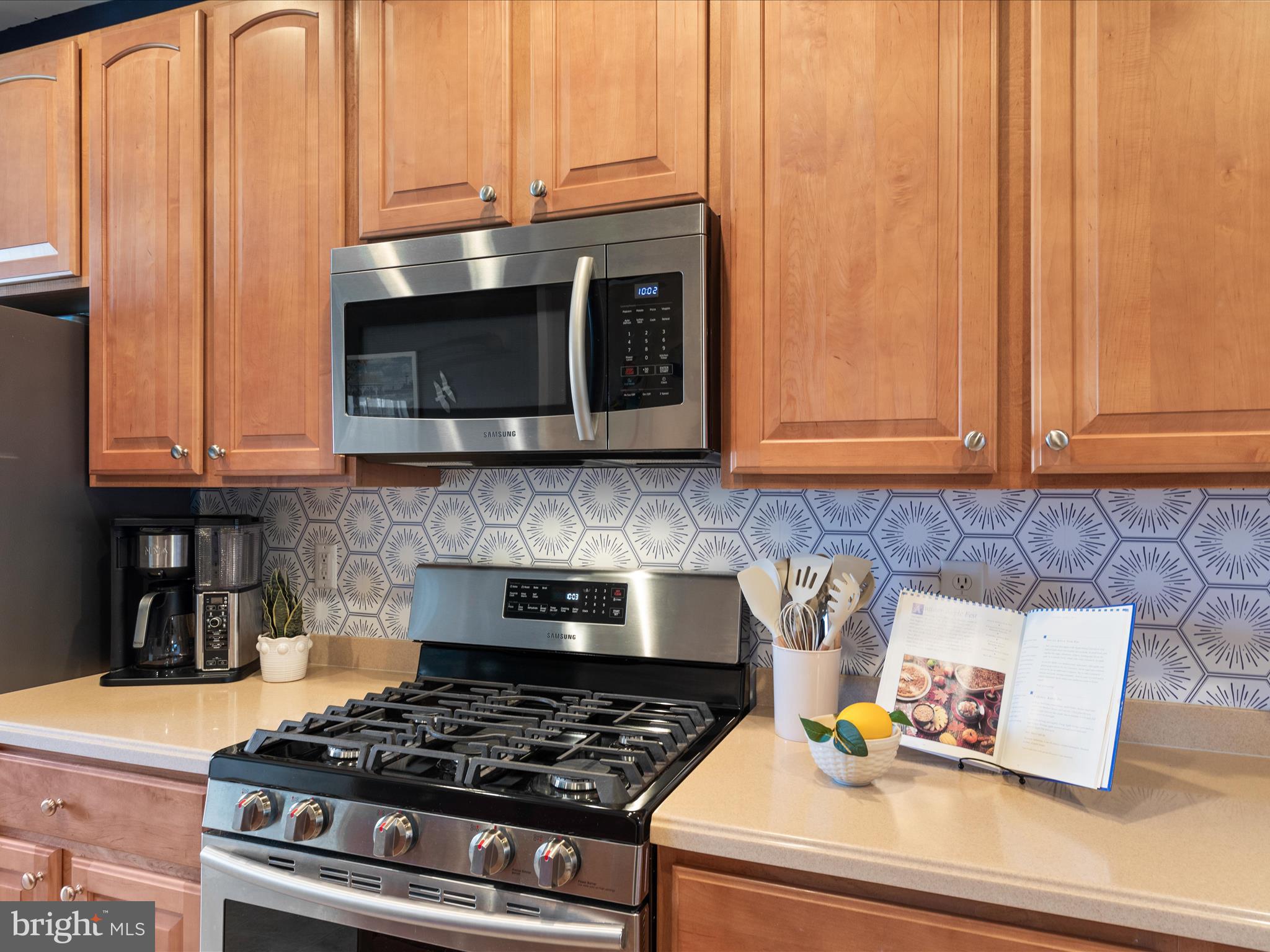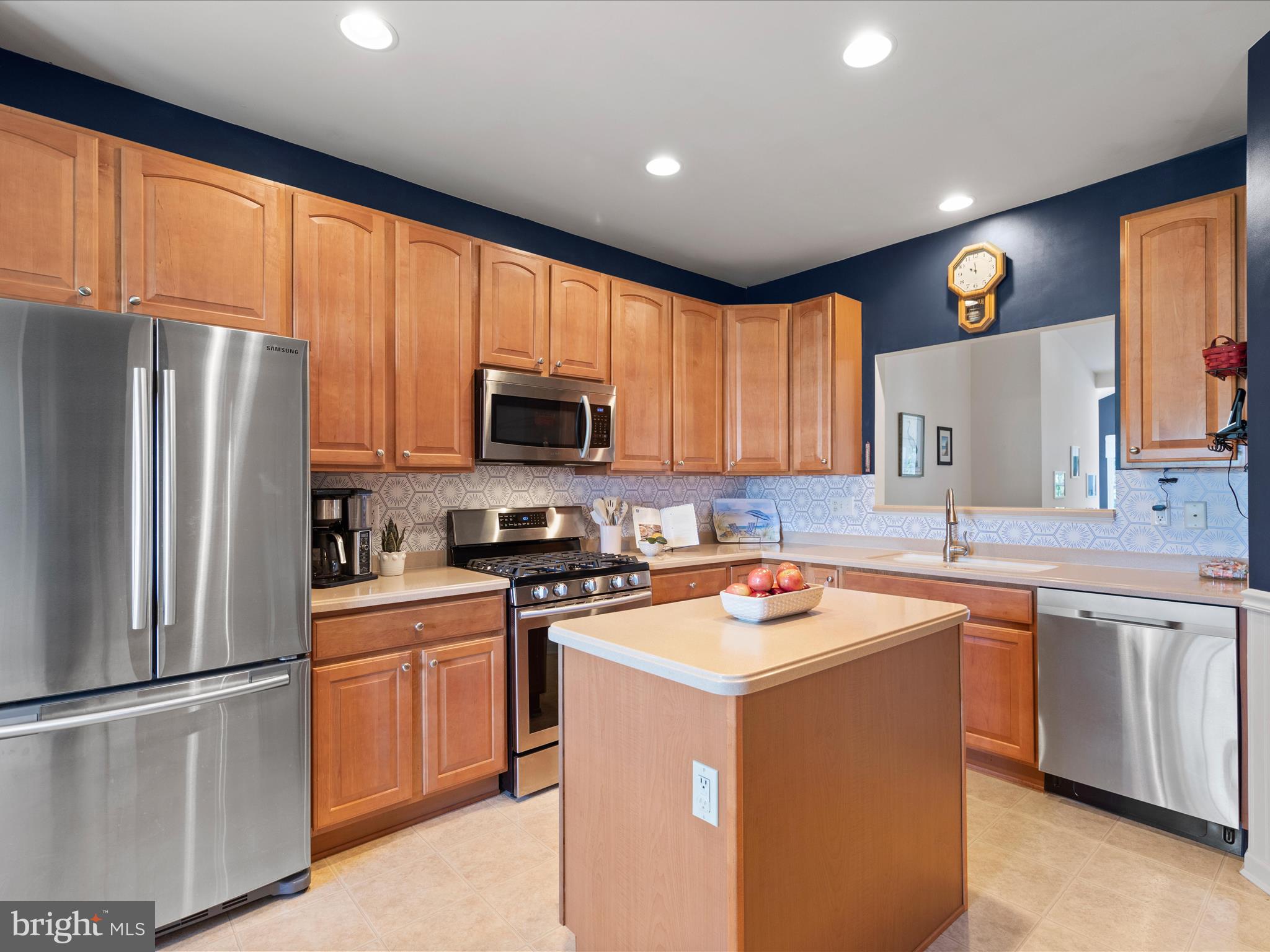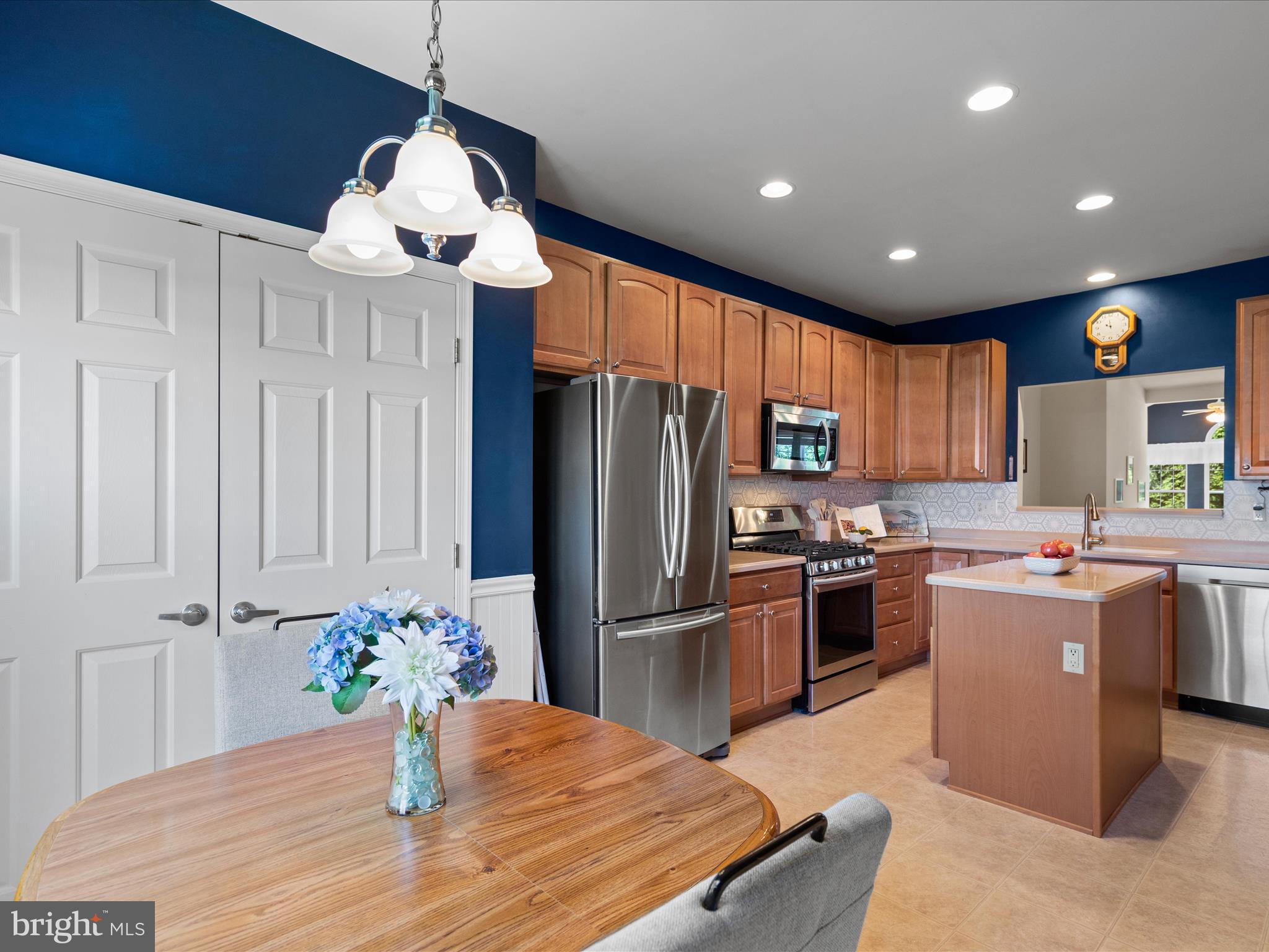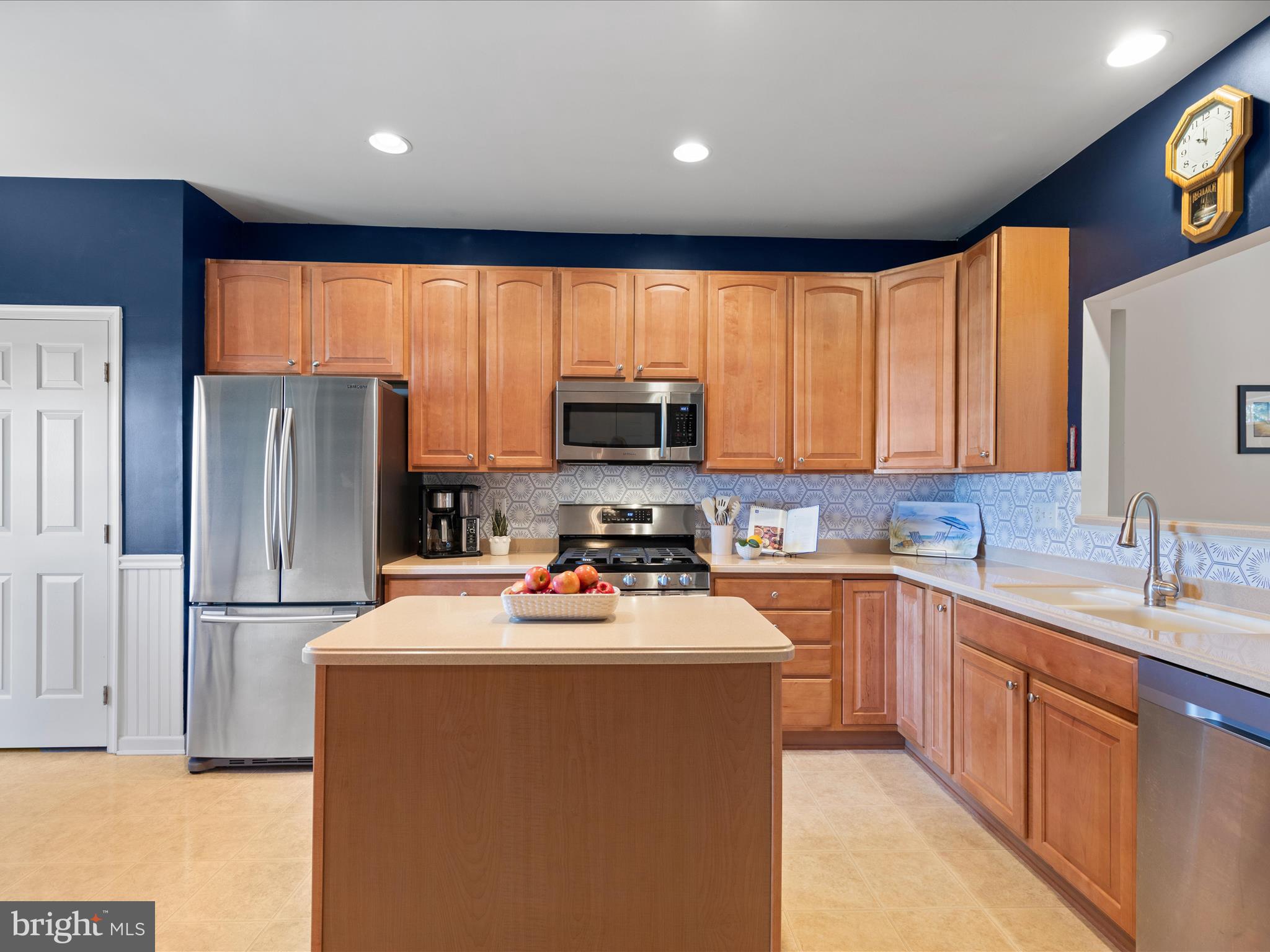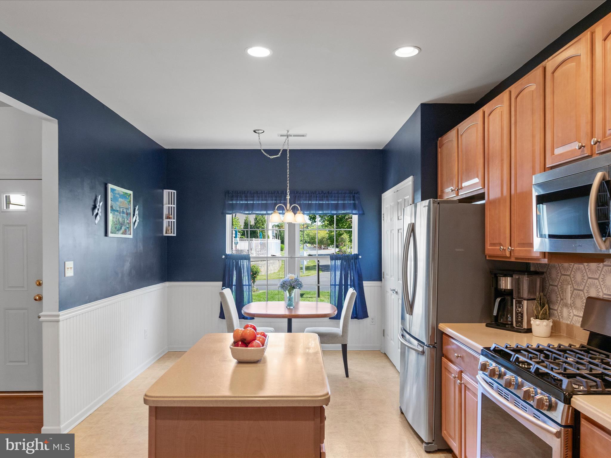 Step inside to a welcoming foyer adorned with wainscoting and laminate plank flooring that flows seamlessly throughout the main living areas. At the heart of the home, the spacious eat-in kitchen invites gathering and connection, featuring stainless steel appliances, a 5-burner gas stove, warm wood cabinetry, a stylish backsplash, center island, and a generous double-door pantry. A convenient pass-through opens to the adjacent living and dining area, enhancing the home's open flow and functionality.