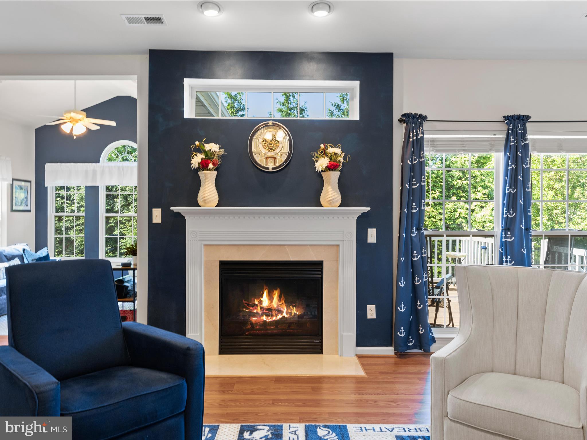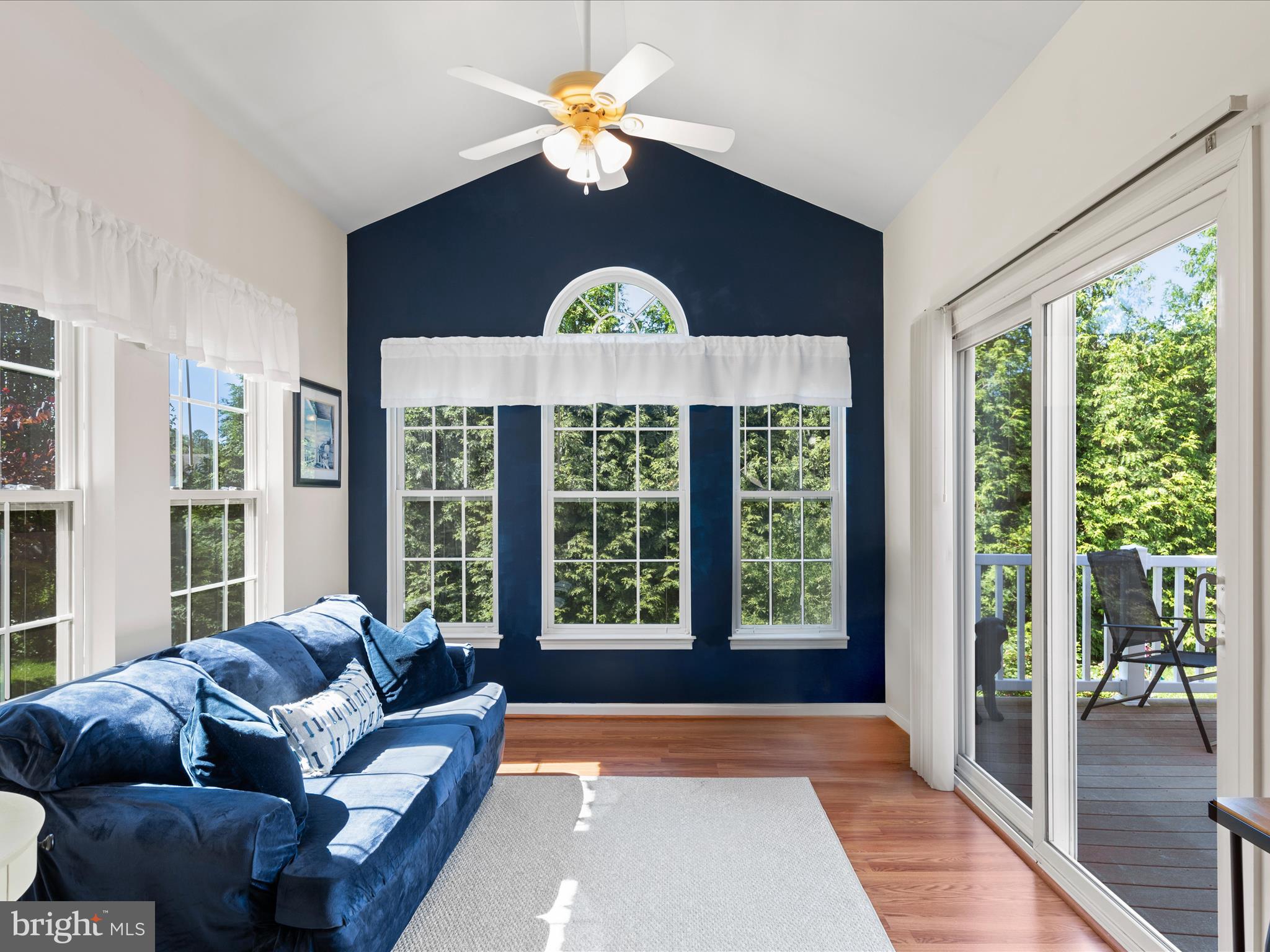 The living room is centered around a cozy gas fireplace and filled with natural light from expansive windows that frame tranquil views of the backyard. There's ample room for a dining table, and the space unfolds beautifully into a sunroom with cathedral ceiling, palladian window, and sliding glass doors that lead to the outdoor living spaces--ideal for entertaining or quiet relaxation.