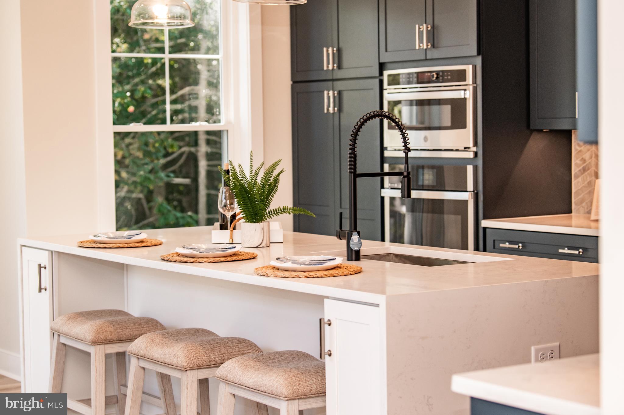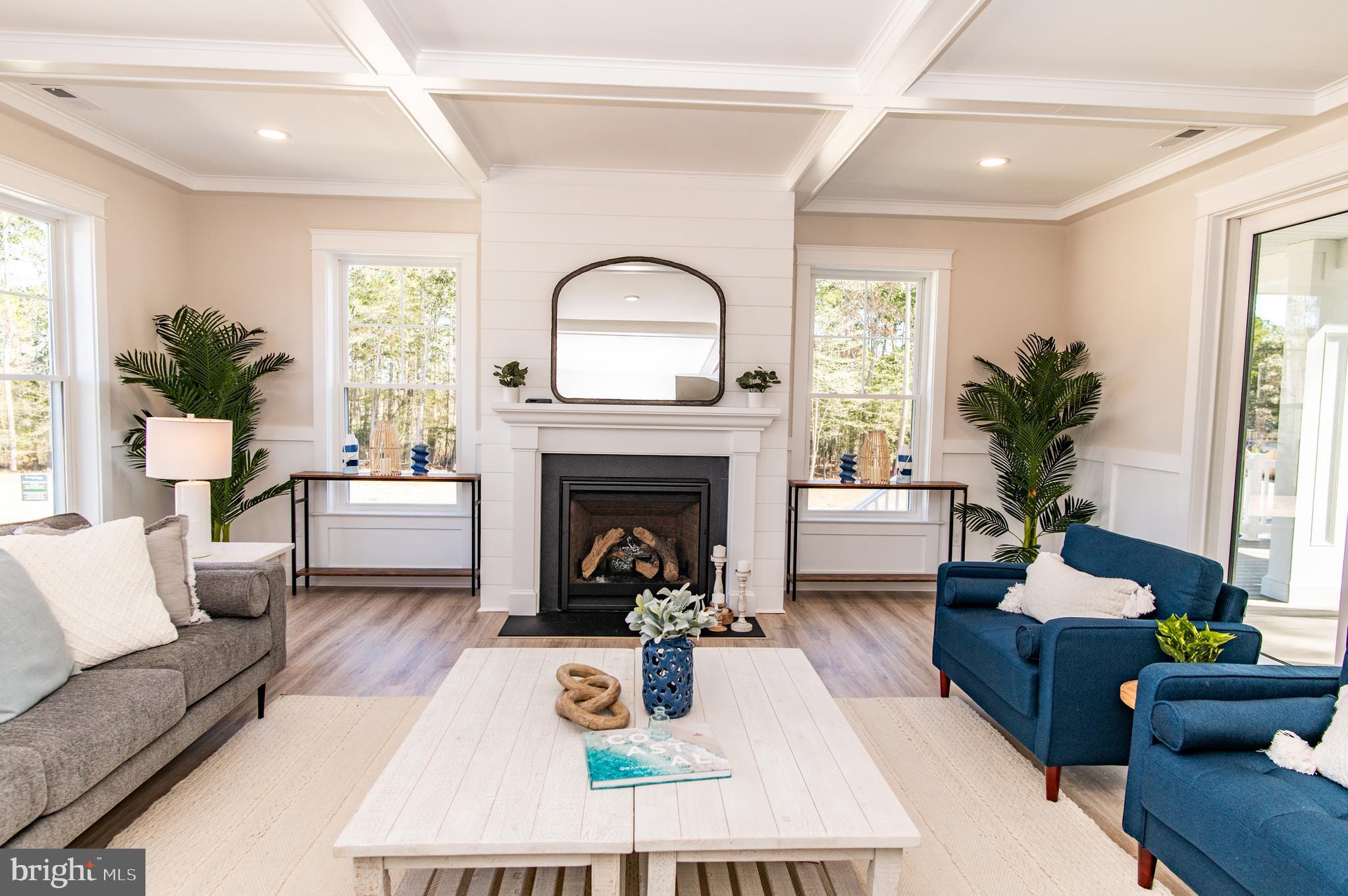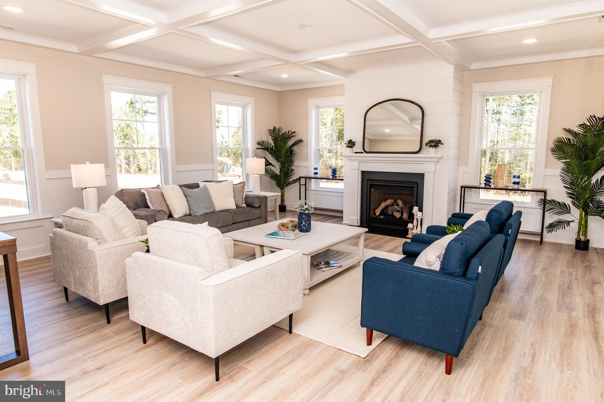 The main level is designed for effortless entertaining and relaxation, featuring a spacious outdoor living room perfect for dining and lounging al fresco. Inside, the gourmet kitchen stands out with stunning blue cabinetry paired with a lighter island, highlighted by a quartz waterfall countertop and sleek stainless steel appliances. Luxury vinyl plank flooring flows throughout the main level, offering durability and easy maintenance. The great room impresses with its coffered ceiling and cozy gas fireplace. Completing this level are a powder room and a private guest bedroom with its own ensuite bath.