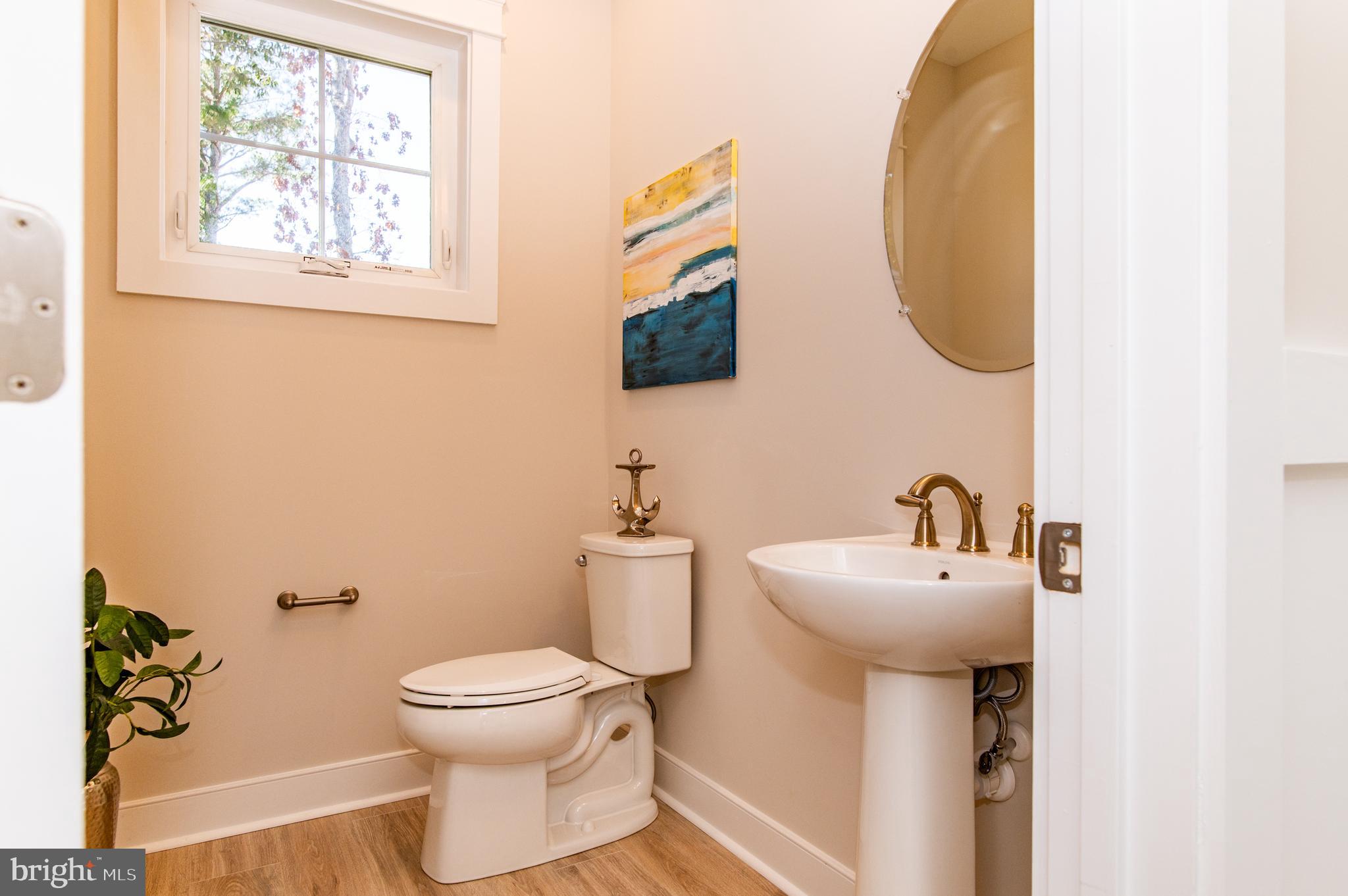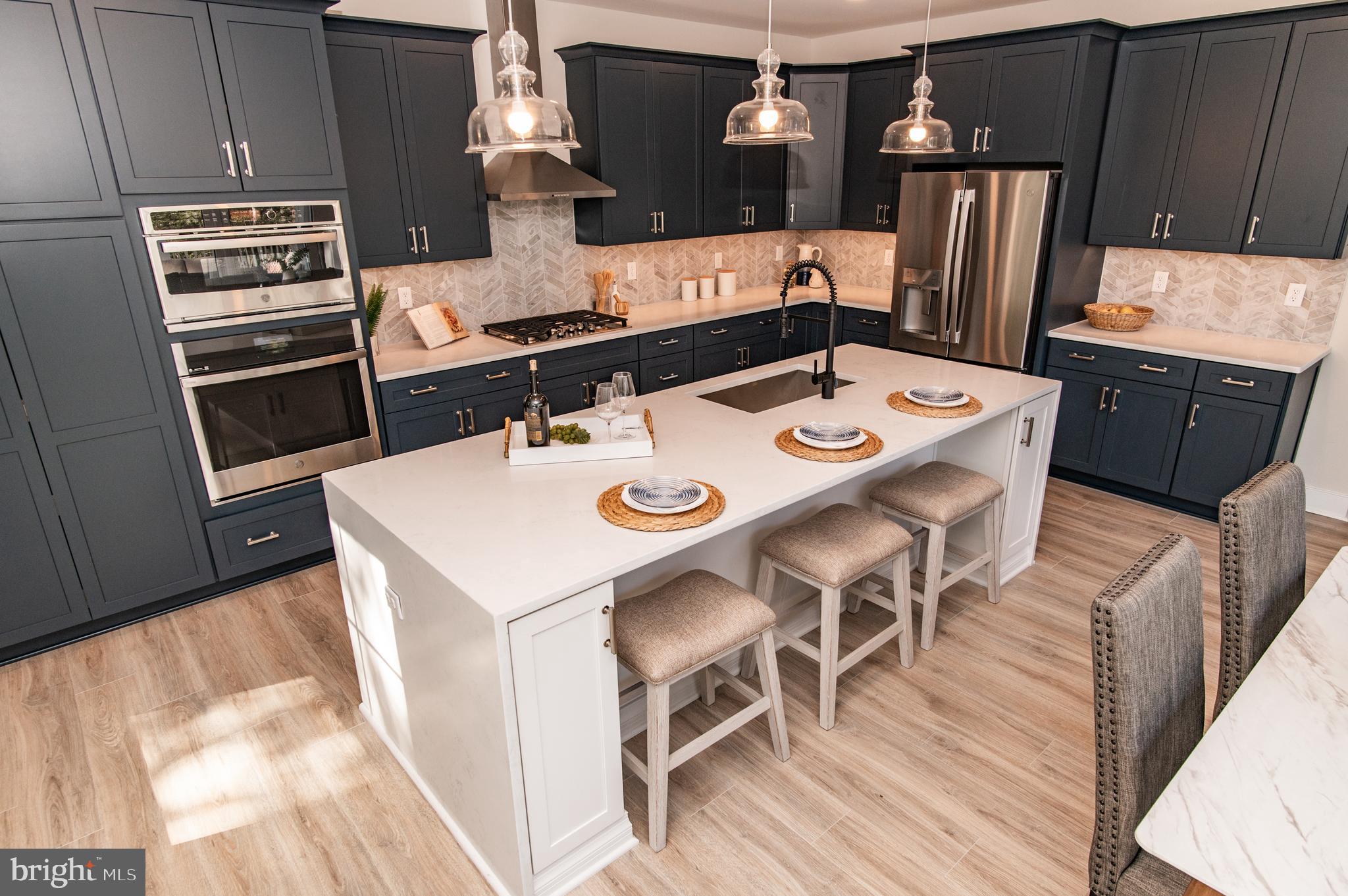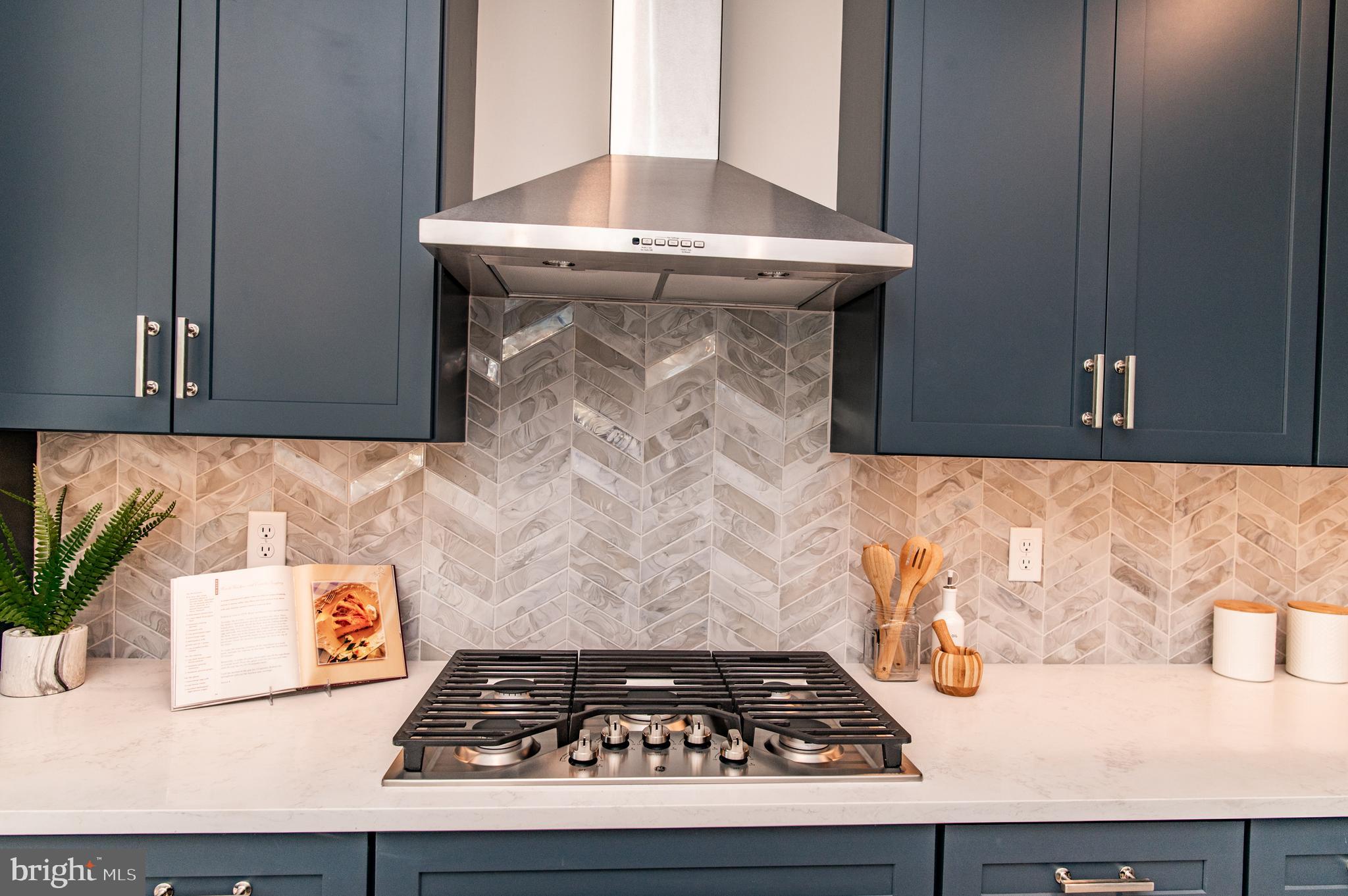 The main level is designed for effortless entertaining and relaxation, featuring a spacious outdoor living room perfect for dining and lounging al fresco. Inside, the gourmet kitchen stands out with stunning blue cabinetry paired with a lighter island, highlighted by a quartz waterfall countertop and sleek stainless steel appliances. Luxury vinyl plank flooring flows throughout the main level, offering durability and easy maintenance. The great room impresses with its coffered ceiling and cozy gas fireplace. Completing this level are a powder room and a private guest bedroom with its own ensuite bath.